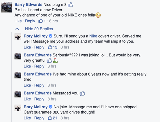 来自红迪网(Reddit)的屏幕截图显示,麦克罗伊回复了球迷巴里-爱德华兹(Barry Edwards),爱德华兹要麦克罗伊的旧耐克一号木。让这位爱德华兹意外和不敢相信的是,麦克罗伊竟然答应满足他的要求。